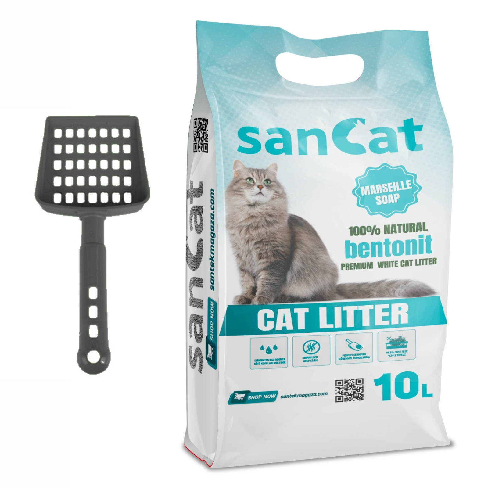 Sancat Premium Marsilya Sabun Kokulu Topaklaşan Beyaz Bentonit Kedi Kumu 10 L + Kürek